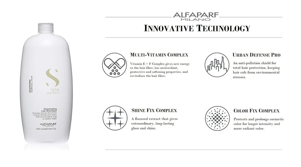 1 x Alfaparf Milano Semi Di Lino Diamond Illuminating Low Shampoo 1 Litre is a uniquely formulated shampoo that transforms dull hair, imparting a soft feel and stunning, glossy finish while ensuring prolonged colour radiance with its exclusive Colour Fix Complex.