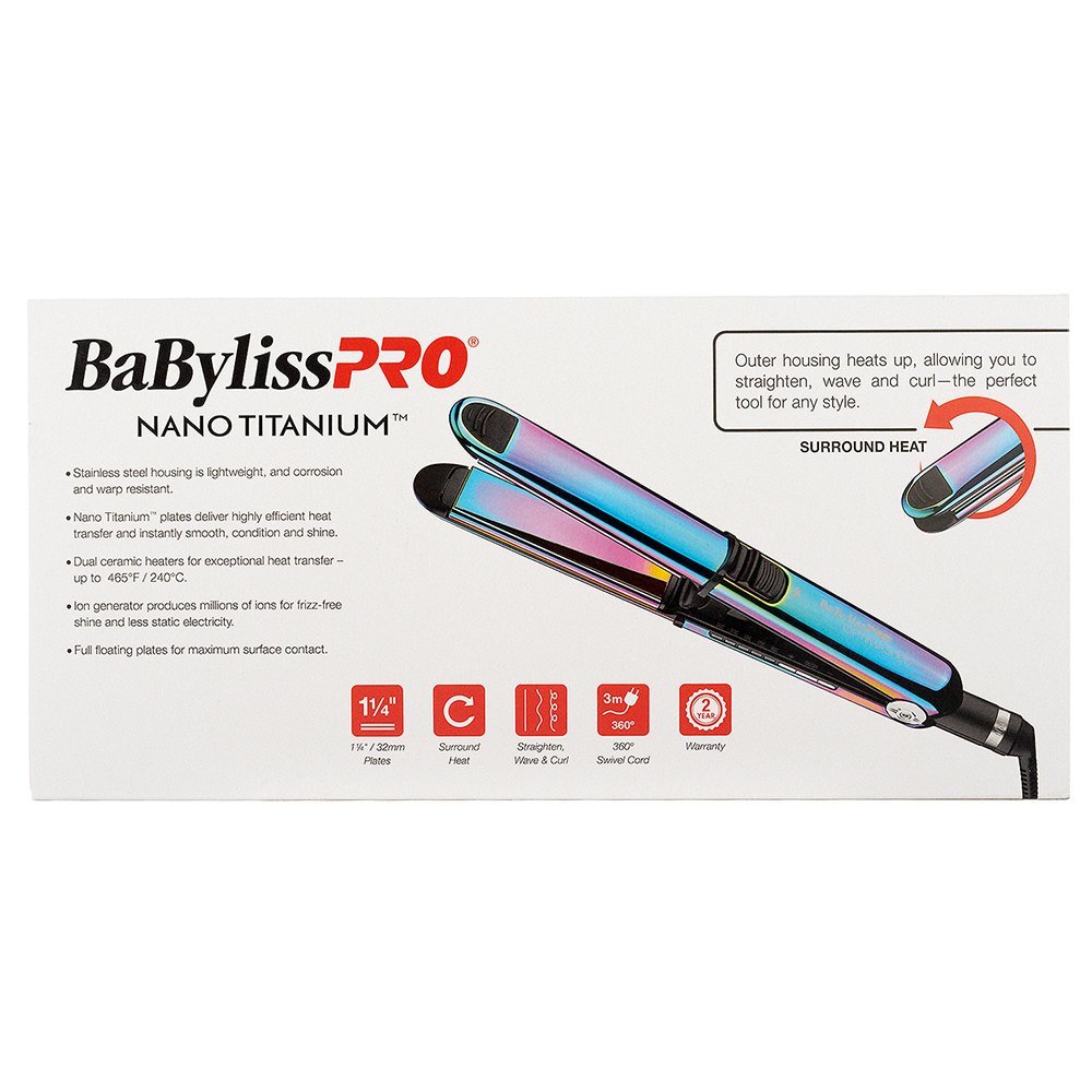 BaBylissPRO Nano Titanium Optima 3000 Hair Straightener Chameleon starts with a special edition iridescent design. Nano titanium 32mm plates for instant silky smoothness with zero frizz. Dual ceramic heaters deliver extraordinarily efficient heat transfer up to 240˚C. Ion Multiplier Technology produces millions of ions for static-free shine. Stainless steel housing is lightweight and corrosion resistant. Convex outer shell heats up, allowing you to straighten, curl and wave to your desire. Enjoy unprecedented results, design and performance in style with BaByliss PRO.