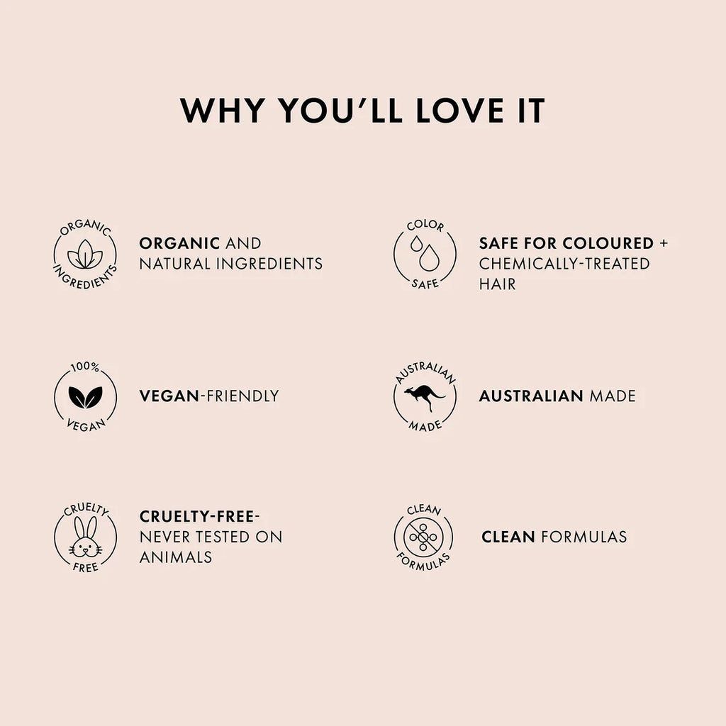 Aloe Barbadensis (Aloe Vera) Leaf Juice*, Behentrimonium Methosulfate, Propanediol, Glycerin, Coco-Caprylate, Glyceryl Stearate, Cetearyl Alcohol, Hydroxypropyl Guar Hydroxypropyltrimonium Chloride, Santalum Acuminatum (Quandong) Fruit Extract*, Equisetum Arvense (Horsetail) Leaf Extract, Hibiscus Sabdariffa Flower Extract (Roselle), Serenoa Serrulata (Saw Palmetto) Fruit Extract*, Coffea Robusta (Green Coffee) Seed Extract, Terminalia Ferdinandiana (Kakadu Plum) Fruit Extract*, Panthenol (Pro Vitamin B5), Cocos Nucifera (Coconut) Oil*, Squalane, Hydrolyzed Quinoa, Simmondsia Chinensis (Jojoba) Seed Oil*, Brazil Nut (Bertholletia Excelsa) Seed Oil*, Persea Gratissima (Avocado) Oil*, Argania Spinosa (Argan) Kernel Oil*, Queensland Nut (Macadamia Ternifolia) Seed Oil*, Rosmarinus Officinalis (Rosemary) Leaf Extract, Polyquaternium-7, Fragrance, Pentylene Glycol, Caprylyl Glycol, Ethylhexyglycerin, Citric Acid.