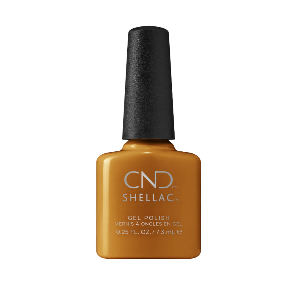 The CND Shellac Gel Polish Willow Talk is a golden caramel brown.