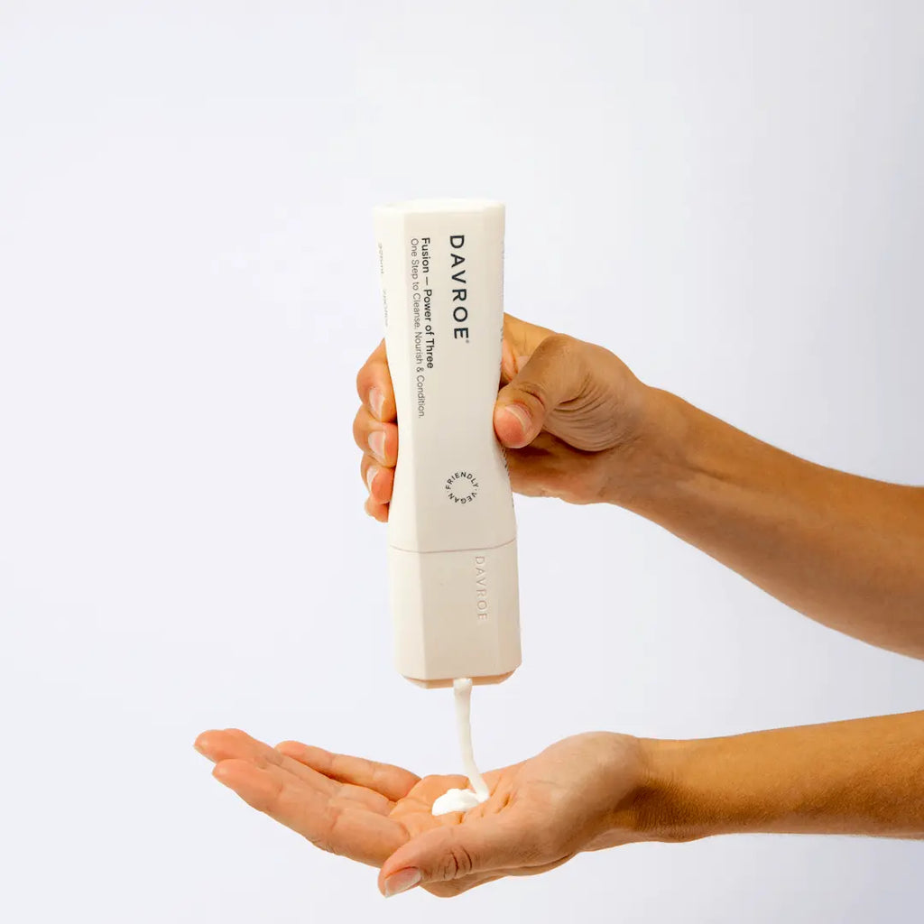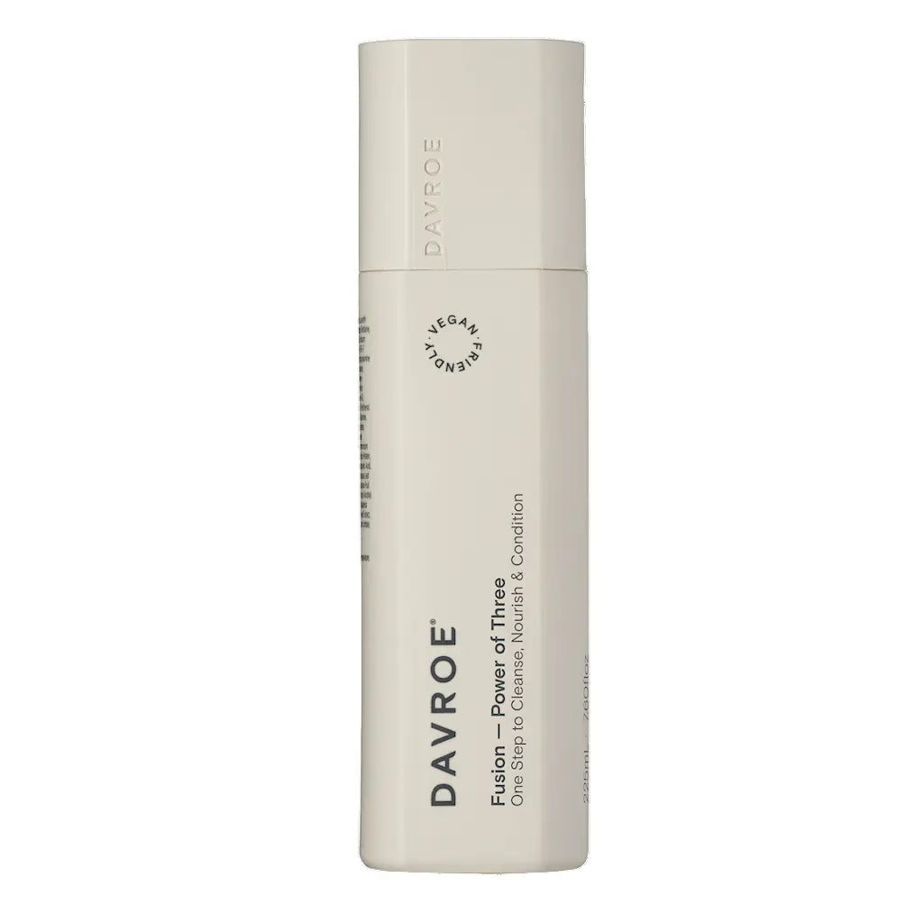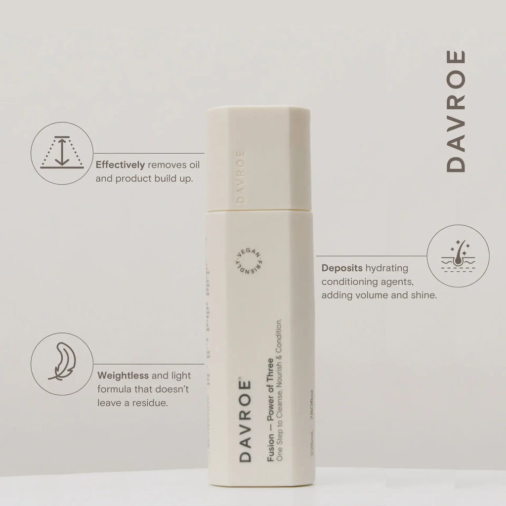 Davroe Fusion Power Of Three is an all-in-one wash designed to effectively cleanse, nourish, and condition hair. Its unique formula eliminates oil and product buildup, while depositing moisturising agents without weighing hair down or leaving any residue. The concentrated Baobab Extract and Shea Butter work together to deeply moisturise, protect, and strengthen hair. Additionally, the use of plant-based conditioning agents and humectants helps to boost volume and add shine. This product is a complete replacement for both your shampoo and conditioner, making it ideal for those with busy schedules, such as hectic mornings, post-workout refreshers, or last-minute events.