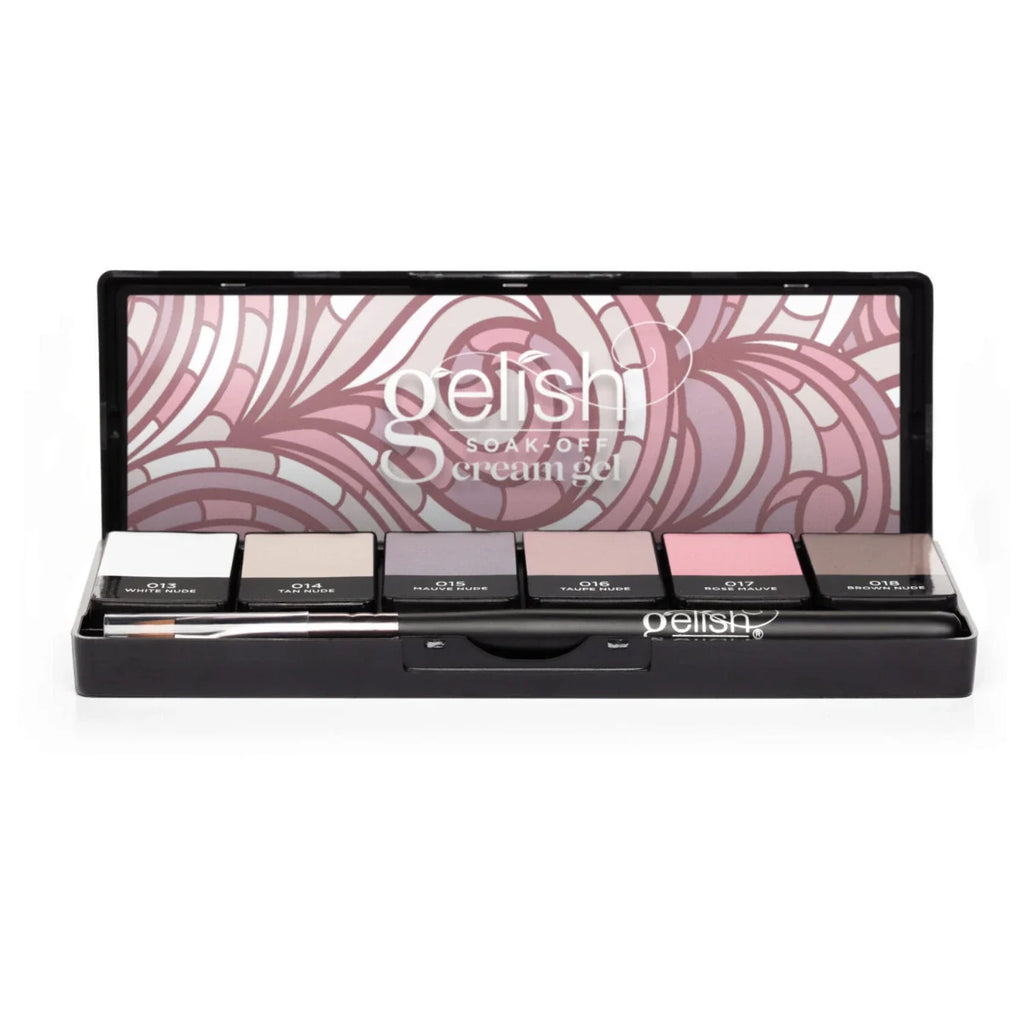 The Gelish Cream Gel Solid Cream Gel Polish Palette Act Natural nail kit contains a unique solid LED gel with a smooth, buttery and workable texture that gives you complete control while working. Each Cream Gel nail kit palette has six colours in a lightweight, portable case that goes where you go with no spilling and no mess.