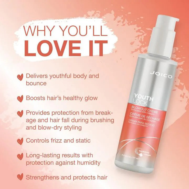 The Joico Youth Lock Blowout Crème is a daily hair care essential, enriched with collagen to protect your hair from breakage, hair fall, and the damaging effects of heat tools and environmental factors like humidity and frizz. This cream not only shields your hair but also works to revitalize and fortify it, effectively reversing the signs of aging.