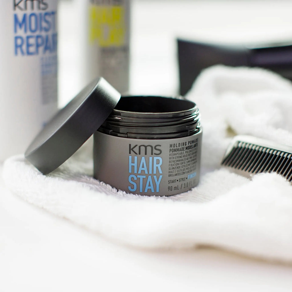 The KMS Hairstay Molding Pomade is an expertly formulated styling product designed to help you achieve flawless and long-lasting hairstyles. Whether you're going for a defined and polished look or a more natural style, this strong hold re-moldable pomade from the HairStay line will provide up to 3 days of hold and protect against humidity, ensuring your hair looks perfect with minimal effort.