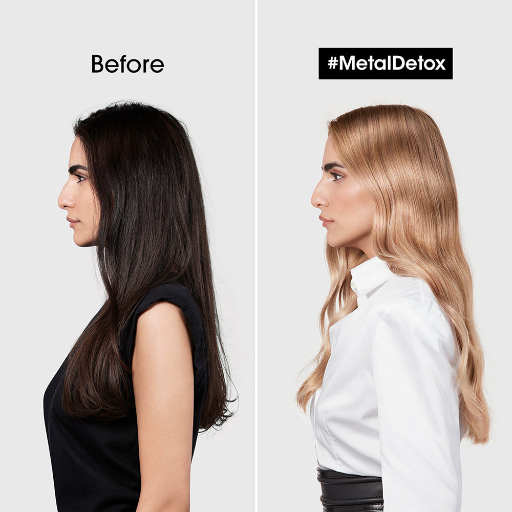 The L'Oréal Professionnel Metal Detox anti-deposit protector mask protects the fiber from particle deposits after any color, balayage or lightening service. It maintains colour vibrancy with intense shine.