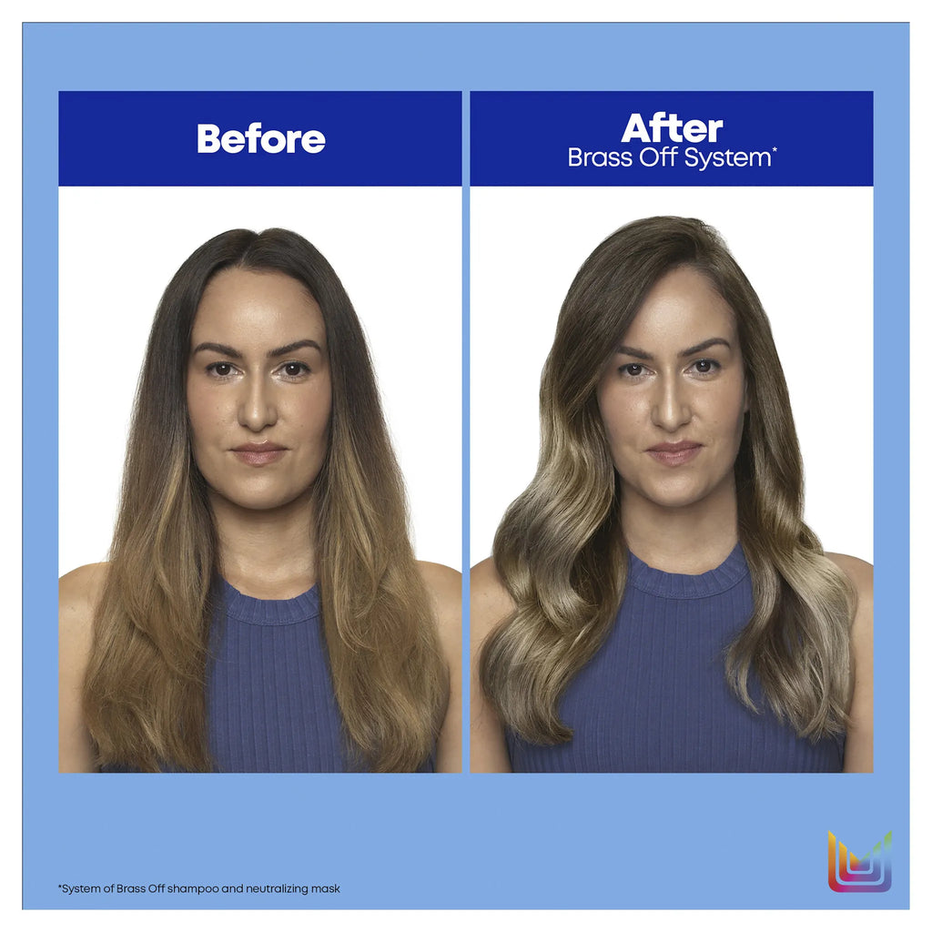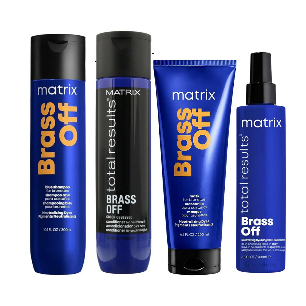 The Matrix Total Results Brass Off Quad includes a professional salon clarifying Shampoo ,Conditioner, Mask and Toning Spray that neutralizes brassy tones while refreshing your hair with cool tones.
