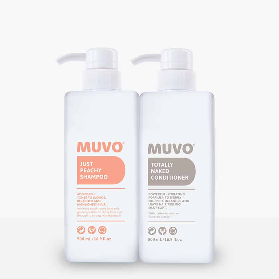 This delicious MUVO Just Peachy / Totally Naked Duo will help you to achieve fresh peach tones from soft, golden pastels, to dusty hues right through to strong, vibrant peach. With a concoction of pink nuances and orange variations; reminiscent of a juicy, ripe peach, MUVO Just Peachy Shampoo will change blonde, bleached and highlighted hair to soft or bright, intense peach tones whilst MUVO Totally Naked Conditioner will ensure your locks maintain moisture & optimum hair health.