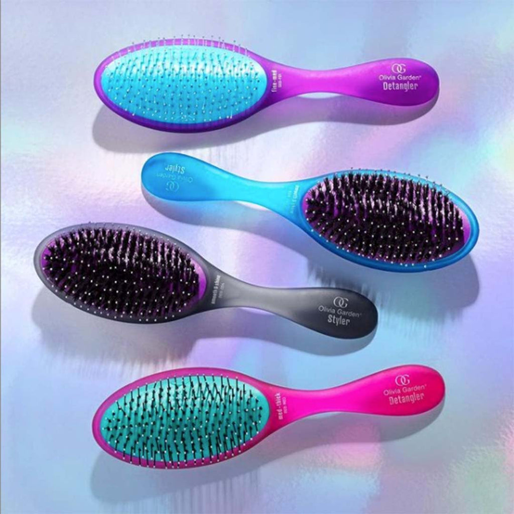 Achieve quick, easy & pain free detangling with the Olivia Garden Detangler. A gentle detangling brush designed with comfortable ball point tips for medium-thick hair types. The specialised bristles actively massage the scalp while brushing to help promote healthy hair. The brush features a removable cushion for easy cleaning.