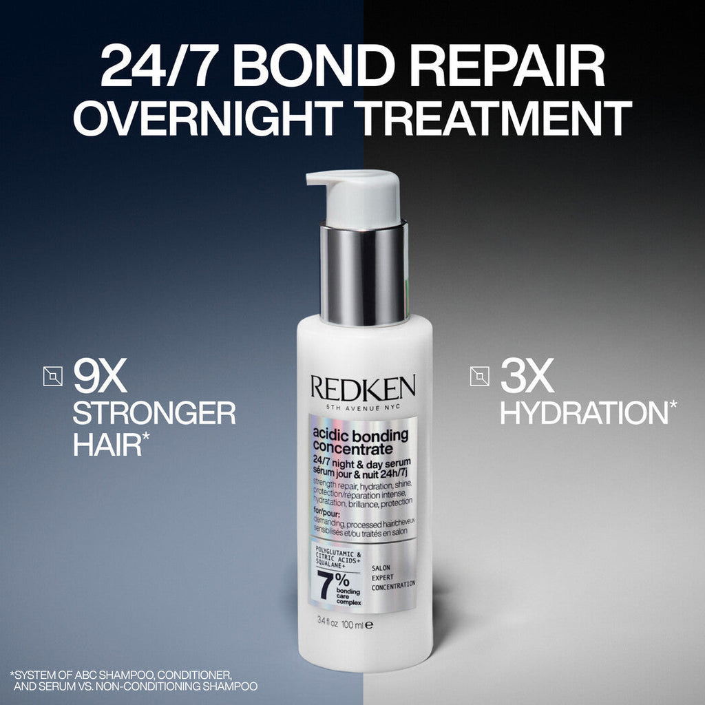 Transform your hair overnight with Redken’s Acidic Bonding Concentrate 24/7 Night & Day Serum—a leave-in treatment that works around the clock to repair, strengthen, and deeply hydrate processed and damaged hair. This revolutionary bonding serum is infused with bonding care technology that reinforces weakened hair bonds, delivering visible results in just one night.