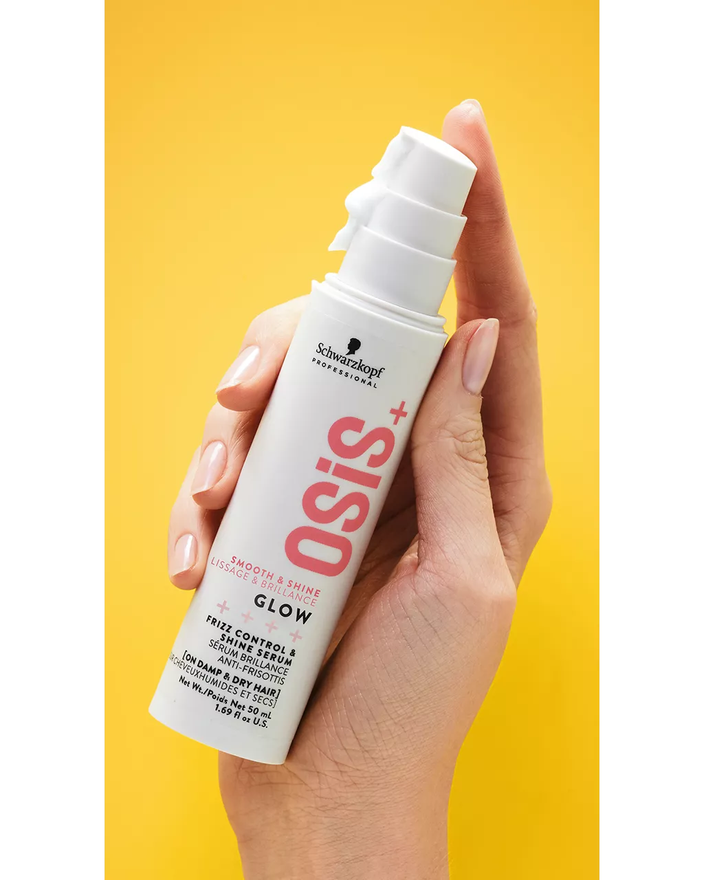 Schwarzkopf Professional OSiS+ Glow is a shine serum that combats straw-like and dull whilst eliminating frizz. It imparts natural shine without causing any heaviness. The silicone-free, anti-frizz serum minimises flyaways and offers moisture protection. For improved manageability and a well-groomed appearance.