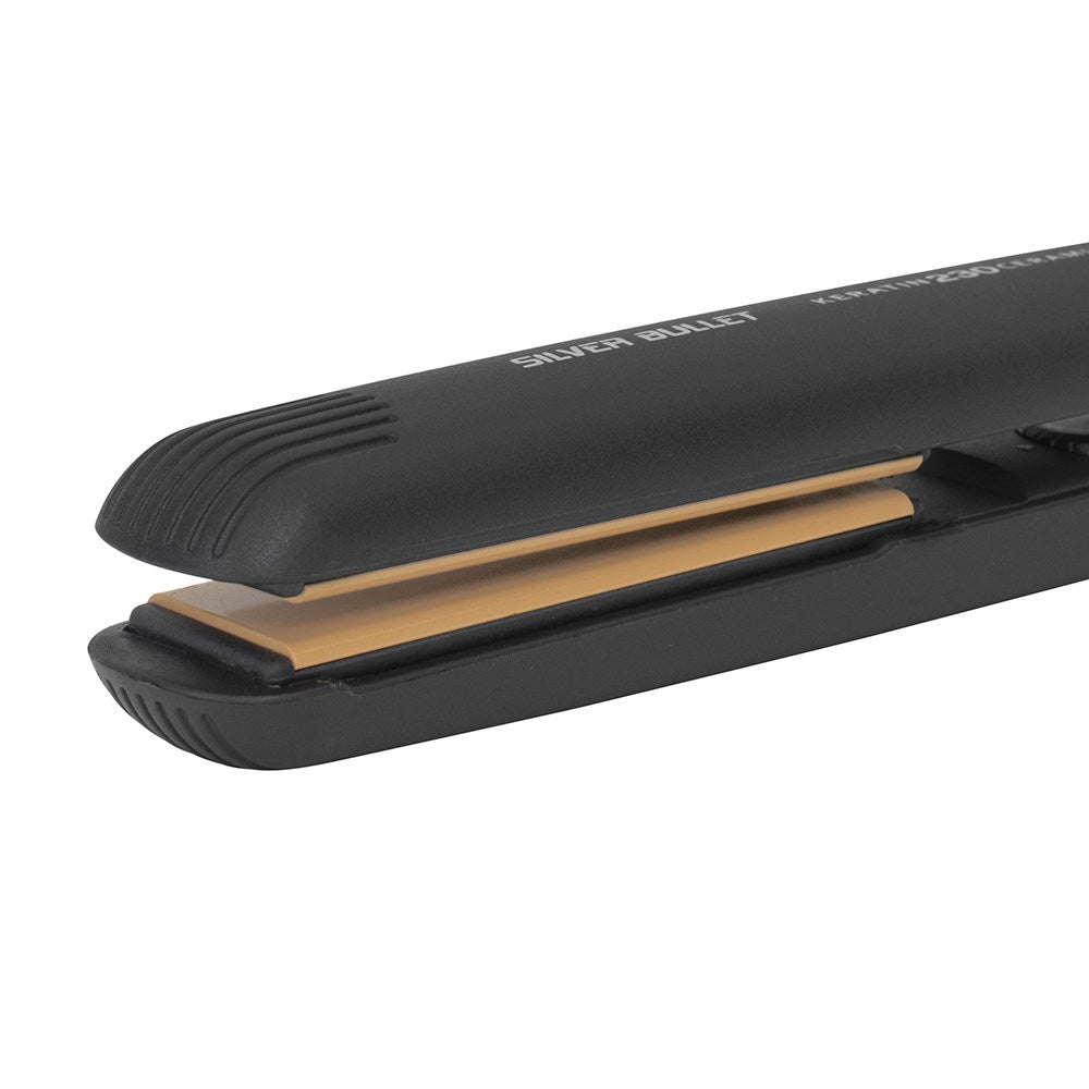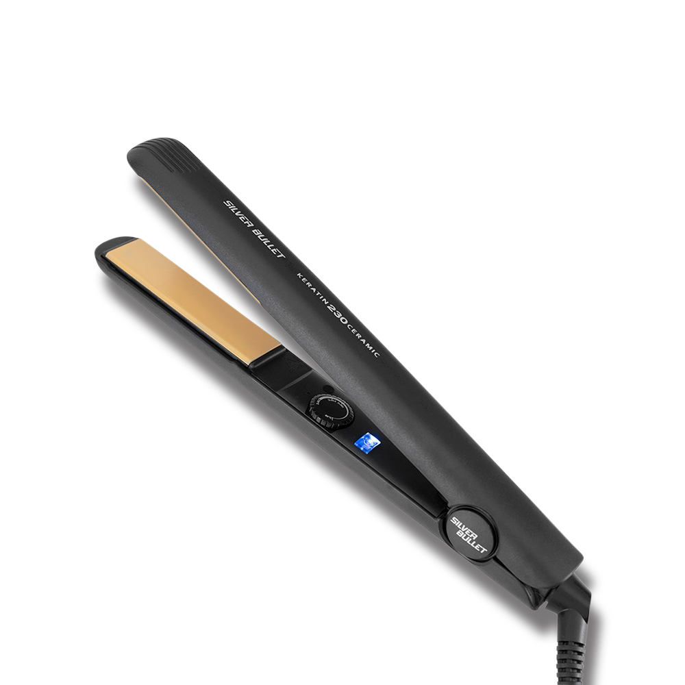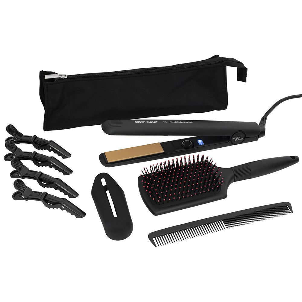 Silver Bullet Keratin 230 Ceramic Hair Straightener 25mm Ceramic and Tourmaline plate surfaces distribute heat rapidly & evenly, variable heat settings up to 230 C suitable for all hair types including medium to thick and difficult to manage hair, auto cut off switch, floating plates glide through hair smoothly. Includes heat resistant mat, paddle brush, sectioning clips and styling comb.
