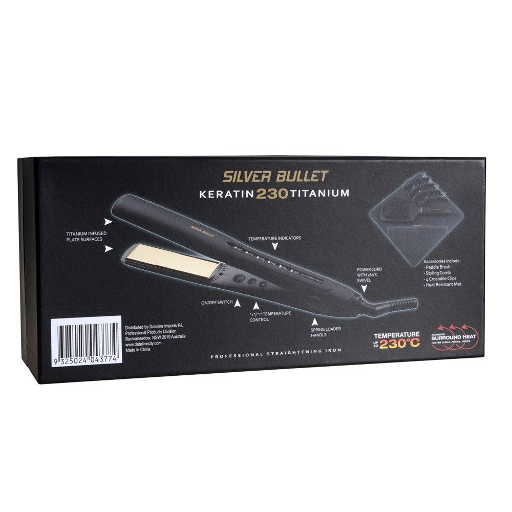 The Silver Bullet Keratin 230 Gold Titanium Hair Straightener 25mm friction-free Titanium plates, variable heat settings up to 230 C suitable for unruly, thick or coarse hair, auto cut off switch, advanced surround heat for faster curls, waves and flicks.If you have struggled with straightening in the past and find your average flat iron isn t up to the task, struggle no more, this iron is for you.